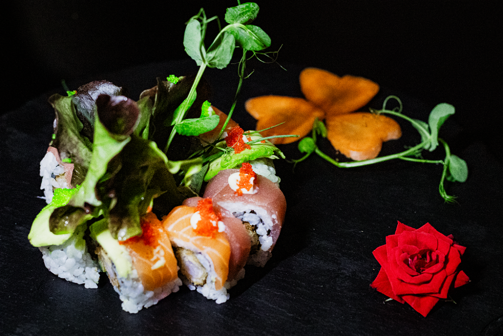 8 ebi met mango, 8 sake avocado maki, 6 calofornia maki,8 dragon rol, 9 kappa maki,9 kani maki,9 sake maki, 9 tekka, sake nigiri, 5 maguro nigiri,5 flamed sake nigiri en sake sashimi